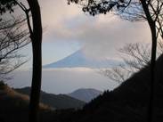 8時28分に第1真富士山を出発し、真富士峠へと下って行く。途中、「清水」への分岐を左にとり、急降下して8時36分に真富士峠に下り立った。ここからも木々の間からきれいな富士山を眺めることができた。