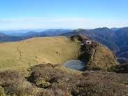 8時10分に「1600m」という標柱があった。この付近が「ダケモミの丘」なのであろうか。この先で8時14分から8時21分まで、N氏にまんじゅうをごちそうになり、休憩した。そして、展望が開け、ザレ場に出たところで、8時35分から8時38分まで休憩した。ここで、下山してきた女性の単独行とすれ違った。聞くところによると、この女性は昨日剣山へ登り、剣山から縦走して、避難小屋に1泊し、今朝避難小屋を出て、三嶺を経由して名頃へ下山するのだという。名古屋からバスできたというなんという健脚か!!びっくりである。こんなところでへたばって休憩している我々がお恥ずかしい。そんな女性に励まされ、ザレ場を登っていると、なんと後ろから自衛隊が登ってくるではないか。なんだ、自衛隊より我々の方が先行していたのかと安心するやら、抜かれまいぞと力をいれるやら・・・そんな中で、危険地帯を通過し、8時54分に池畔に飛び出した。