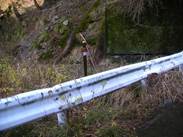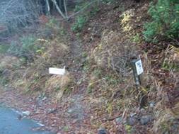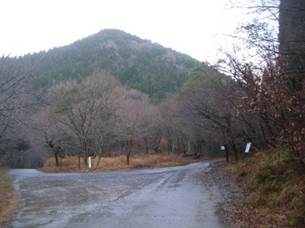 右へ進むと、抜土方面であり、本谷橋登山口であるが、すぐにゲートがあり、一般車は通行できない。左へ進むと、石田川ダムへ通じている。この三叉路に「落合登山口 700m」という道標がある。これが三重嶽への登山口であろう。予定通り、左へ進むと、7時03分に「三重嶽登山口」という標柱のある場所に着いた。ちょうどよい具合に駐車広場もある。車は4〜5台ほど止められる広さだ。