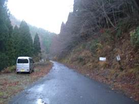 12時42分に車をスタートさせ、このまま石田川ダムの方へ出ることにした。途中に「三重嶽 3.2km」という道標があり、さらに進んだところに林道分岐があり、そこには「三重・武奈登山口」という高島トレイルの標柱があった。