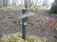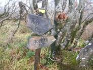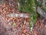 「武奈ヶ嶽 4.9km」という標柱と、「武奈ヶ嶽 5.1km」、「大御影山 6.1km」、「三重嶽 0.2km」という道標がある。また、「近江坂 3.4km」、「頂上 0.2km」という道標もあるが、「近江坂 3.4km」の意味がどうしても分からない。大日尾根分岐まではたしか3.6kmなのだから、近江坂はそれより手前にあるということなのだが、以前に抜土から、近江坂へ上がり、大御影山経由で大日尾根分岐まで歩いたときの記憶からすると、近江坂は大御影山(6.1km)より遠いはずなのに、近い距離表示とは?大日尾根へ向かう途中の「887m峰」のあたりから近江坂へ下る登山道があるのであろうか。これは謎のままであった。