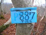 平原から下ると、9時12分に高島トレイルの標柱があり、ここから登り返すと、9時21分に「P943」の札があるピークに出た。さらに緩やかに下っていくと、9時33分に「P887」という札があるピークに着いた。