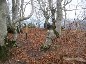 この付近が「762m峰」と思われる。やがて、8時33分には右から尾根が合流してくる平坦な場所に出る。ここが「844m峰」である。もう三重嶽は目の前に迫っているが、ここからはまた急登になるのだ。その急登が治まったかと思う、8時56分に本谷橋からの登山道が合流する。