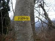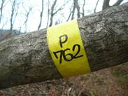 木に黄色のビニールテープが巻かれ、その上に黒のマジックで「P844」と書いてあるのだ。この先で尾根が分かれている。さらに下ってくると、11時56分に「P762」地点に着いた。