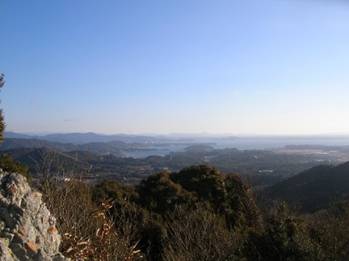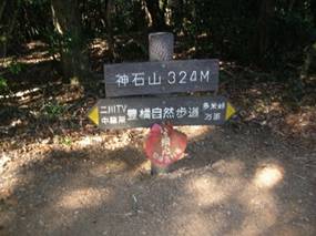先客がベンチで食事中であった。「石巻山 3km 多米峠 2.5km」「葦毛湿原 3.3km」「二川 5km」「至 御手洗 0.8km」「至 普門寺 0.6km」という道標がある。11時33分にここを出発した。11時38分に鉄塔の横を通過した。そして、11時49分に神石山山頂(324m)に飛び出した。